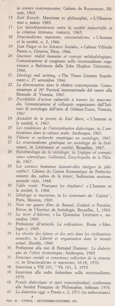 Sulla personalità di LUCIEN GOLDMANN; Alcune note su LUCIEN GOLDMANN; Bibliografia essenziale di LUCIEN GOLDMANN, in Utopia n. 9/10, settembre / ottobre 1971