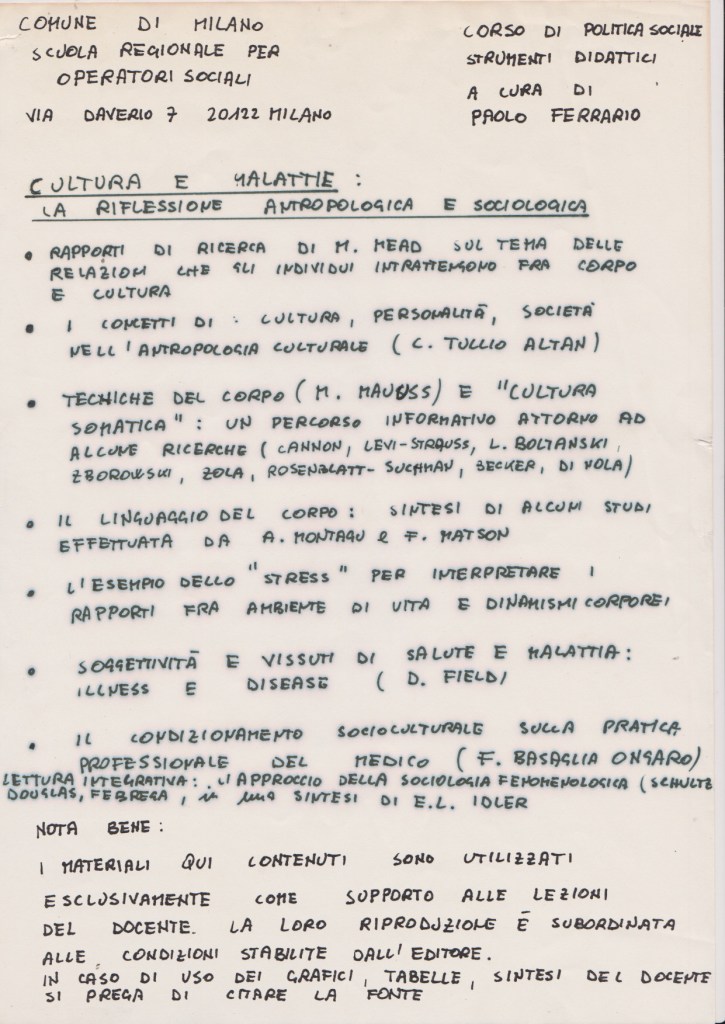 Paolo Ferrario, Cultura e malattie: la riflessione antropologica e sociologica, Appunti per la scheda didattica del Corso di Politica Sociale, Scuola regionale per operatori sociali del Comune di Milano, primi anni ’80