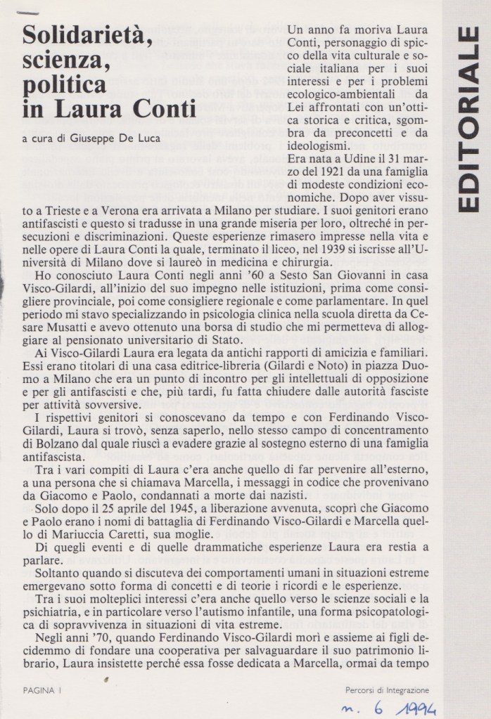 Solidarietà, scienza, politica in LAURA CONTI, di Giuseppe De Luca, in Percorsi di integrazione n. 6, 1994