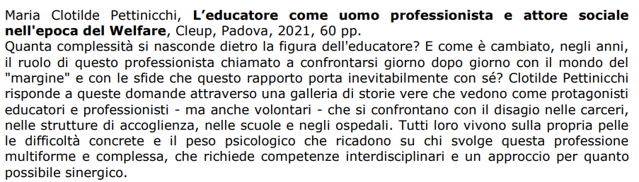 Le vicende dei protagonisti di questo saggio non sono solo un utile strumento per tracciare un ritratto in chiaroscuro della figura dell’educatore, ma ci aiutano anche a ridefinire e a dare nuova dignità al ruolo di questi professionisti, messo duramente in discussione dalla crisi del Welfare State.