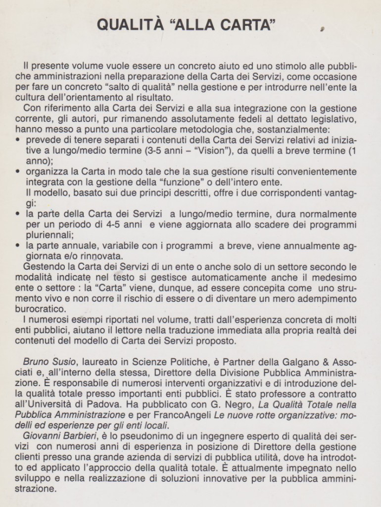 Bruno SUSIO, Giovanni BARBIERI, prefazione di Alberto Galgano, Qualità “alla carta”, verso l’eccellenza con la Carta dei Servizi, FrancoAngeli, 2002