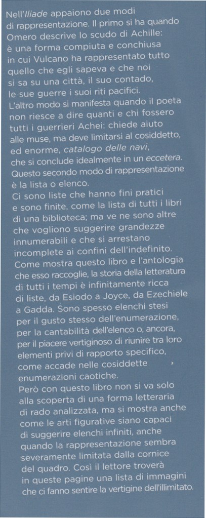 - Antologia letteraria: Brani scelti (da Omero a Gadda, da Borges a Perec) che mettono in pratica l’arte dell’elenco.