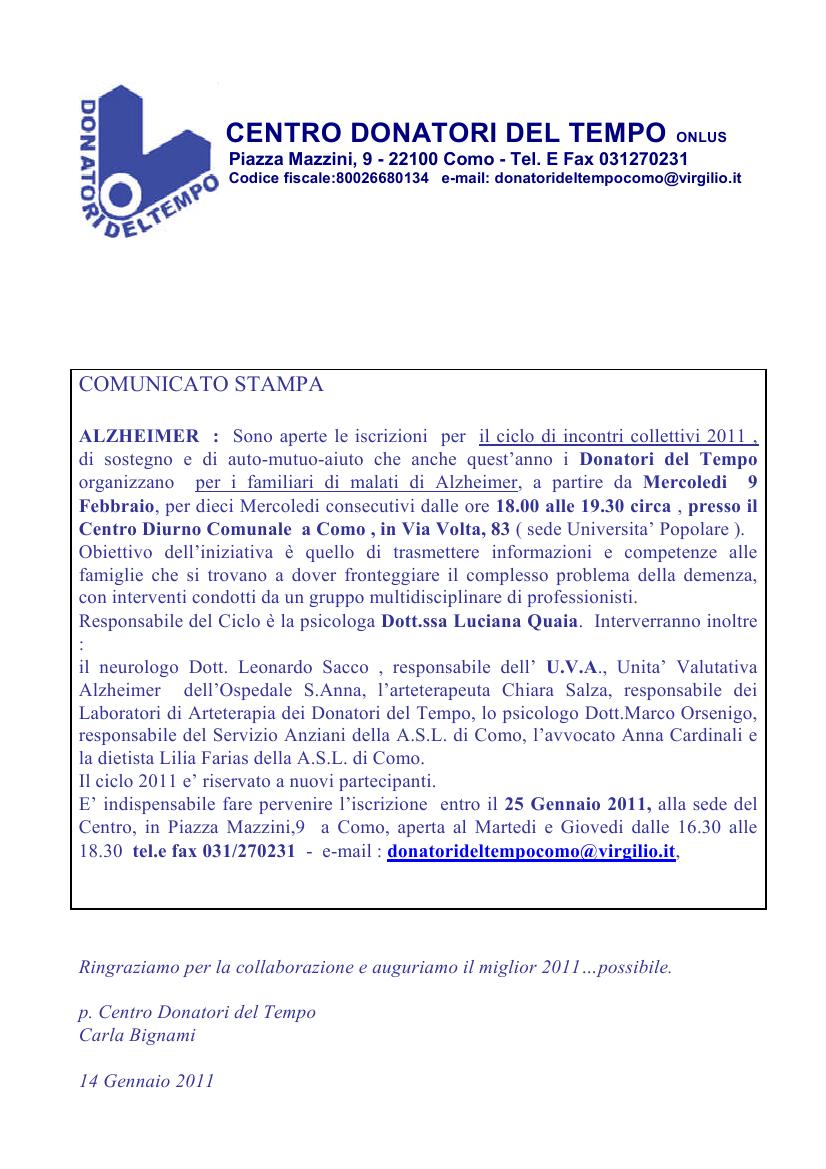 Ciclo di incontri di sostegno e mutuo aiuto per familiari di malati Alzheimer, a cura cel Centro Donatori del tempo, Como, 2001