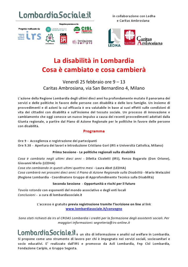 La disabilità in Lombardia Cosa è cambiato e cosa cambierà Venerdì 25 febbraio ore 9 – 13 Caritas Ambrosiana, via San Bernardino 4, Milano