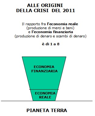 Alle origini della crisi economica del 2011: il rapporto fra economia reale ed economia finanziaria è di 1 a 8. Grafico di Paolo Ferrario