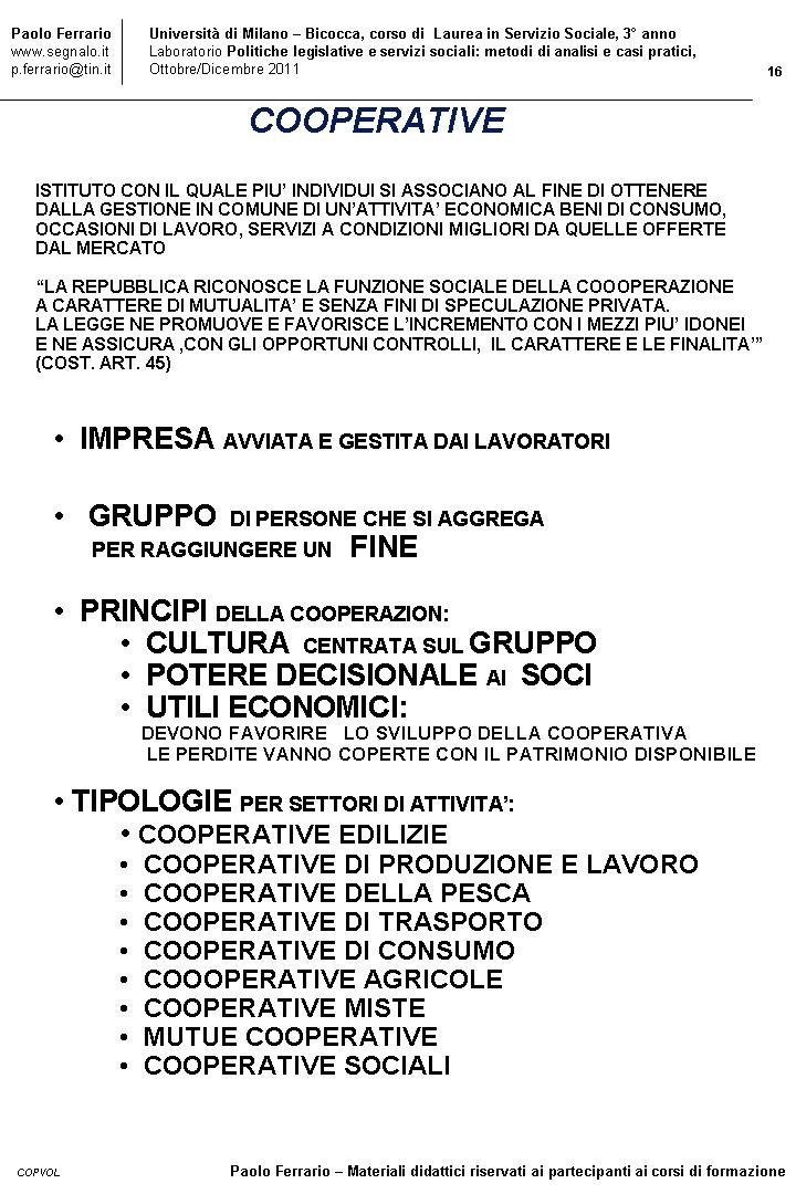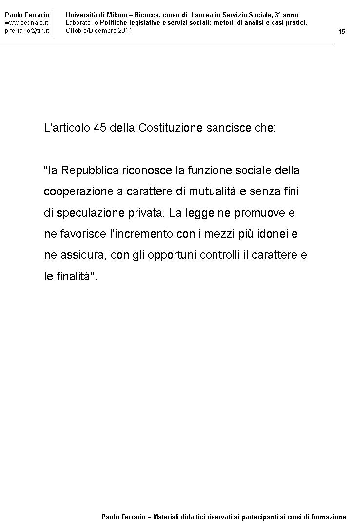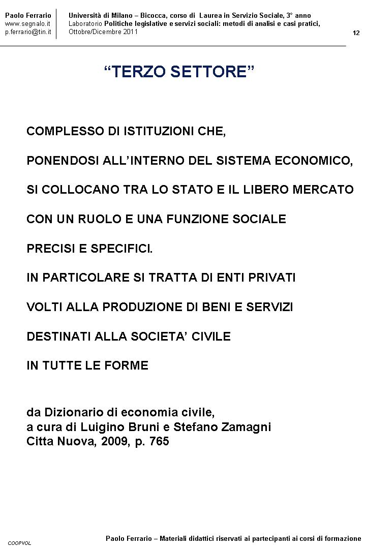 Soggetti del “TERZO SETTORE” Una ricognizione sulle politiche legislative, a cura di Paolo Ferrario, 2 dicembre 2011