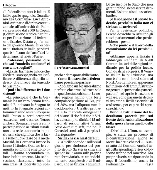 federalismi tedesco e spagnolo alla prova della crisi. intervista a Luca Antonini, ordinario di diritto costituzionale alla Università di Padova, da Il Mattino del 26 luglio 2012
