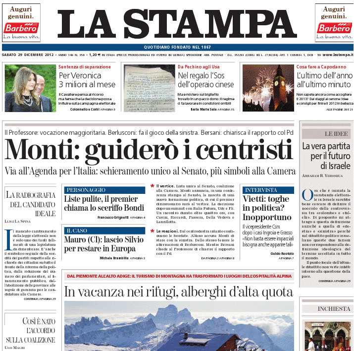 Corriere della sera e Stampa, prima pagina 29 dicembre 2012