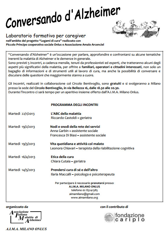 A famigliari, operatori e cittadini è dedicata l’attività di informazione e formazione “Conversando d’Alzheimer”, incontri formativi tenuti da professionisti ed esperti, che trattano alcuni degli aspetti più significativi della malattia, per informare e condividere dialogando delle questioni che maggiormente stanno a cuore (5 incontri mensili all’anno presso Circolo Bentivoglio, in via Bellezza 16 a Milano).
