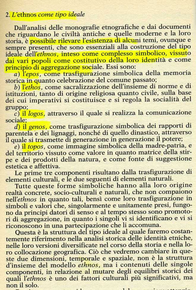 Tullio – Altan tratta i concetti di Ethos, Epos, Logos, Genos e Topos nel 3° capitolo, intitolato L’IDENTITA’ ETNICA COME TIPO IDEALE (pagine 19-31
