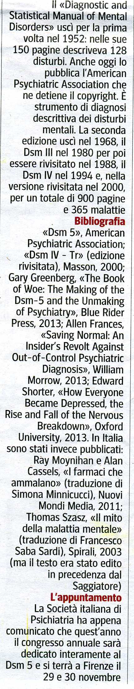 cronologia del DSM Diagnostic and statistical manual of mental desorders, tratto dall’articolo Chi è in lutto va curato, lo dice il manuale, di Francesca Ronchin in Corriere della sera 26 maggio 2013