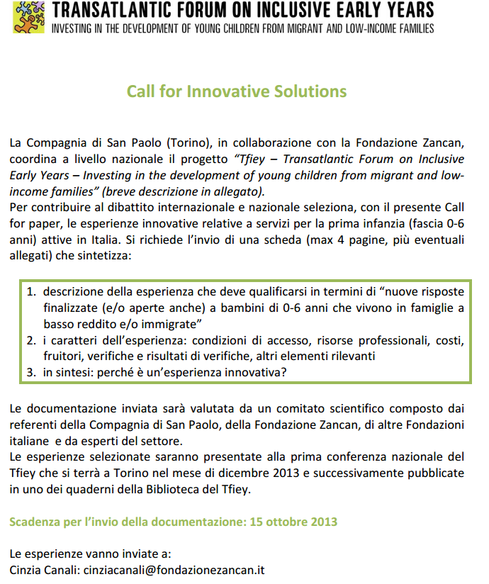 In preparazione del primo convegno nazionale sul tema “INVESTIRE NELL’INFANZIA È COLTIVARE LA VITA” che si svolgerà a Torino nel mese di dicembre 2013 (data da definire), abbiamo lanciato un Call for Innovative Solutions sulleesperienze innovative nei servizi per la prima infanzia (fascia 0-6 anni) attive in Italia. Per partecipare, si richiede l’invio di una scheda secondo le indicazioni indicate in allegato.