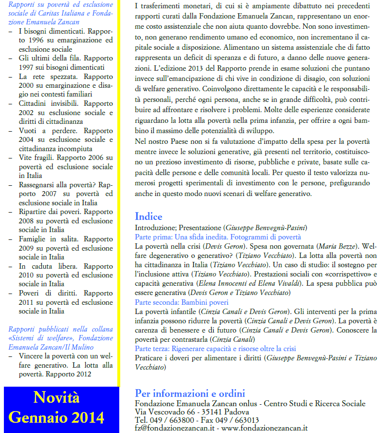 RIGENERARE CAPACITA’ E RISORSE: la lotta alla povertà, Rapporto 2013, a cura della Fondazione Zancan, edizioni Il Mulino, p. 224