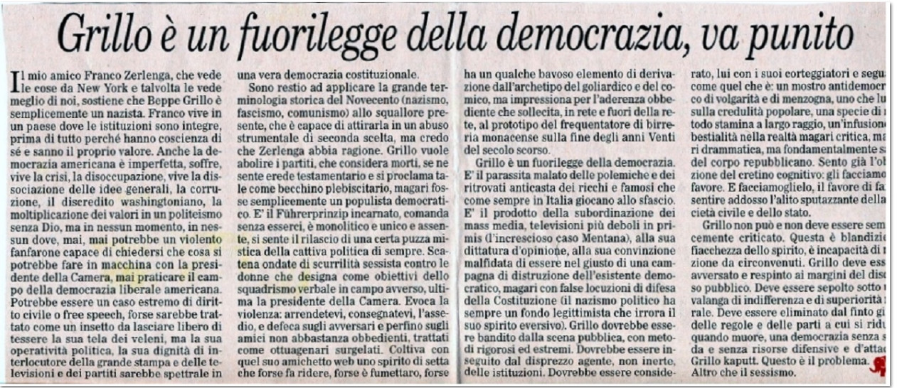 Grillo dovrebbe essere bandito dalla scena pubblica, con metodi rigorosi ed estremi. Dovrebbe essere inseguito dal disprezzo agente, non inerte, delle istituzioni.