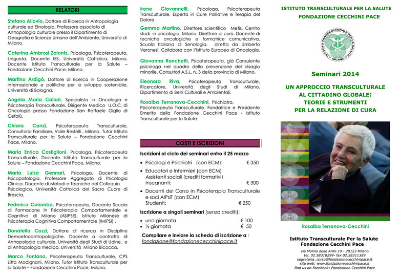Abbiamo chiesto l’accreditamento per l’evento con ECM per psicologi, psicoterapeuti, medici psichiatri, educatori professionali e infermieri e Crediti formativi per gli Assistenti sociali: siamo riusciti a proporre un buon numero di crediti ad un costo davvero competitivo, in modo da rimanere attrattivi sia come costi sia come qualità dell’offerta e permettere così al maggior numero di persone interessate di iscriversi. Si tratta di una vera novità per noi e vi chiediamo un aiuto nel diffondere l’iniziativa ai vostri colleghi e nei Servizi di cui fate parte, con diffusione ove lo riteniate necessario anche personalizzata. Non esitate a chiamarci per ogni ulteriore informazione, alleghiamo depliant e scheda di iscrizione. Cordialmente, Rosalba Terranova-Cecchini |