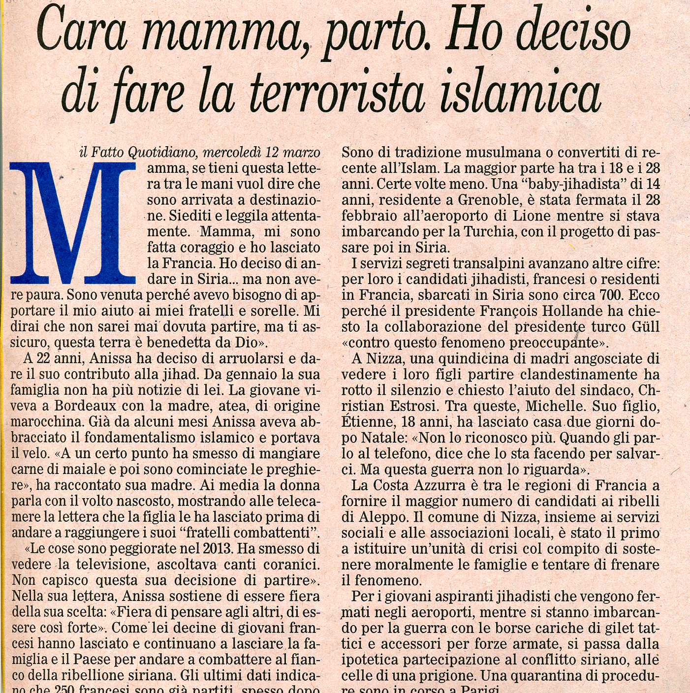 “cara mamma, parto. Ho deciso di fare la terrorista islamica”, di Luana De Micco, in Il Fatto quotidiano 12 marzo 2014