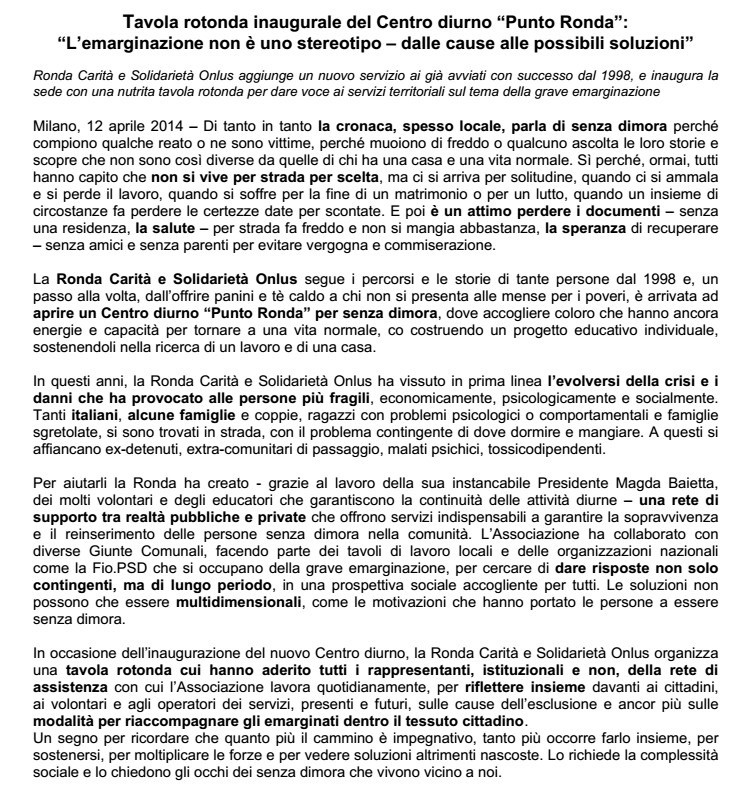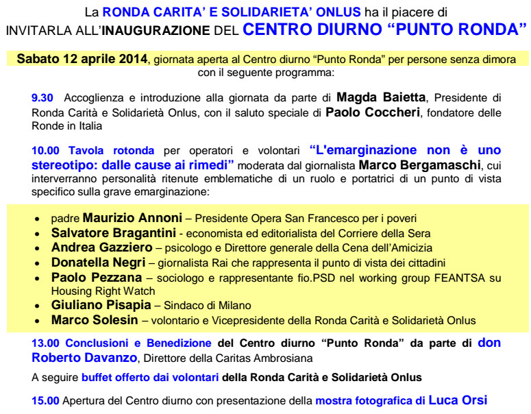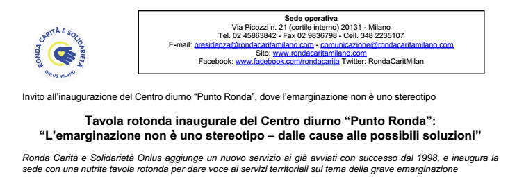 Sabato 12 aprile 2014 abbiamo il piacere di inaugurare il Centro diurno Punto Ronda con un programma composito per aiutare a comprendere la realtà dell’emarginazione e per dare un contributo anche di vicinanza a chi ha particolarmente subito la crisi economica.