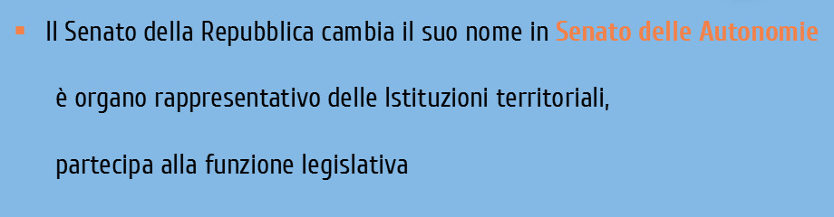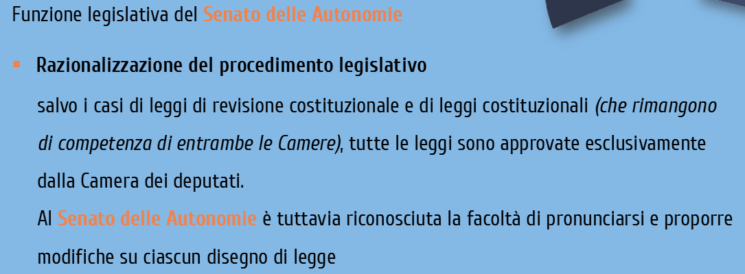 «Il regolamento del Senato delle Autonomie disciplina le modalità di esame dei disegni di legge trasmessi dalla Camera dei deputati. I disegni di legge costituzionali e di revisione costituzionale sono esaminati dal Senato delle Autonomie articolo per articolo e approvati a norma dell’articolo 138.