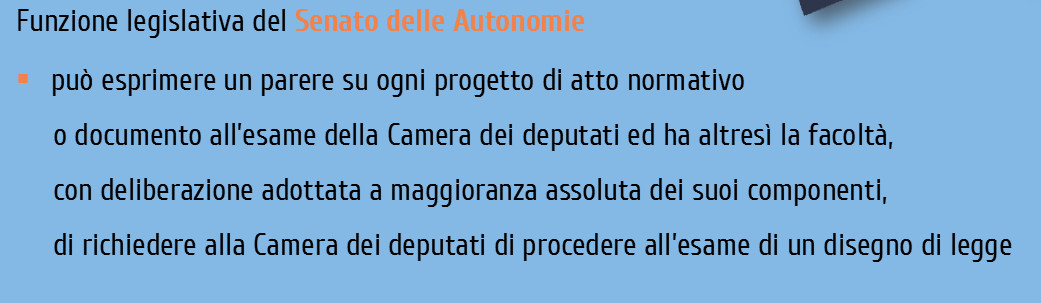 «Il Senato delle Autonomie può, con deliberazione adottata a maggioranza assoluta dei suoi componenti, richiedere alla Camera dei deputati di procedere all’esame di un disegno di legge. In tal caso, la Camera dei deputati procede all’esame e si pronuncia entro il termine di sei mesi dalla data della deliberazione del Senato delle Autonomie.».