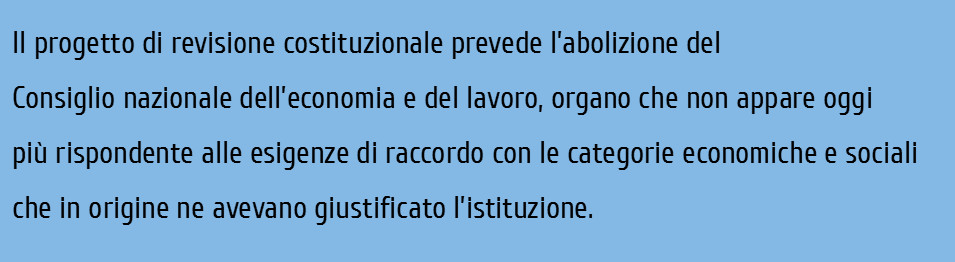 Il progetto di revisione costituzionale del Titolo V conferma l’abolizione delle Province, prevede il superamento dell’attuale frammentazione del riparto delle competenze legislative tra Stato e Regioni in favore di un decentramento legislativo più funzionale allo sviluppo economico e sociale del Paese, sopprime inoltre il Cnel. [scheda di sintesi – slide]