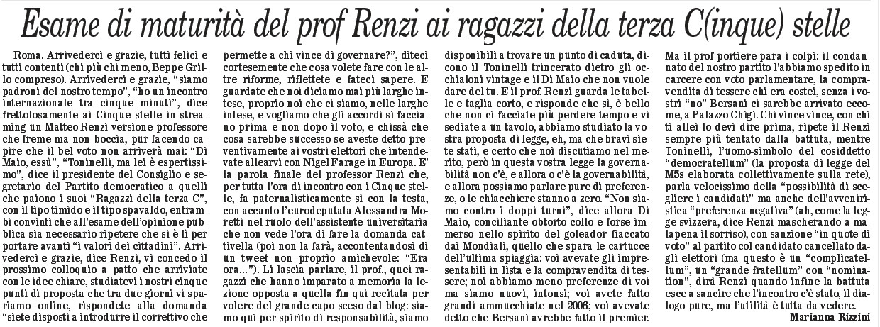 Marianna Rizzini, Esame di maturità del prof Renzi ai ragazzi della terza C(inque) stelle, Il Foglio 26 giugno 2014
