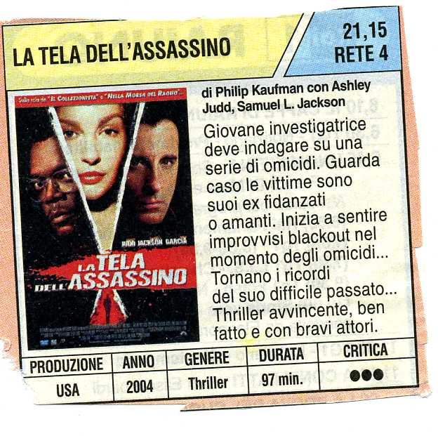 LA TELA DELL’ASSASSINO, di Philip Kaufman, con Ashley Judd, Samuel L. Jackson, 2004