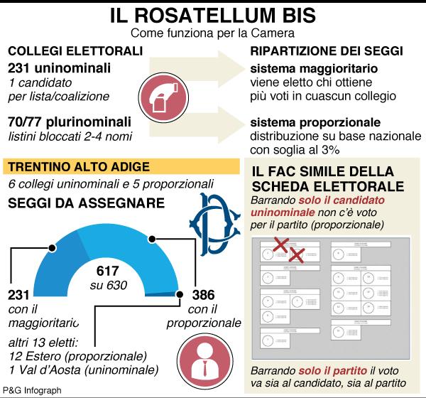 Mix proporzionale (64%) e collegi uninominali (36%). Possibilità di coalizione, unica e a livello nazionale. Soglia di sbarramento al 3% per le liste singole e del 10% per le coalizioni. Massimo 4 nomi nei listini del proporzionale. Pluricandidature: 1 collegio uninominale e massimo 3 nel proporzionale. Non c’è possibilità di voto disgiunto. Questi
