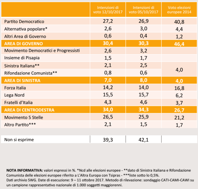 Sorgente: Sondaggi elettorali SWG, il declino dell’area a sinistra del PD