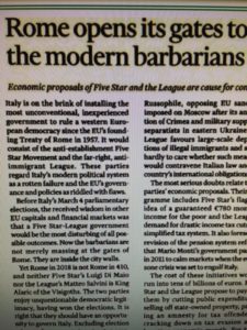 Before Italy’s March 4 parliamentary elections, the received wisdom in other EU capitals and financial markets was that a Five Star-League government would be the most disturbing of all possible outcomes. Now the barbarians are not merely massing at the gates of Rome. They are inside the city walls.