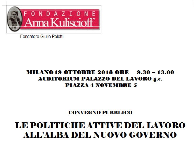 Le politiche attive del lavoro all’alba del nuovo governo, convegno della Fondazione Anna Kuliscioff, Milano, 19 ottobre 2018, ore 9,30 – 13. Interventi di: Claudio Negro,Antonio Bonardo, Alberto Brambilla, Maurizio del Conte, Marco Leonardi