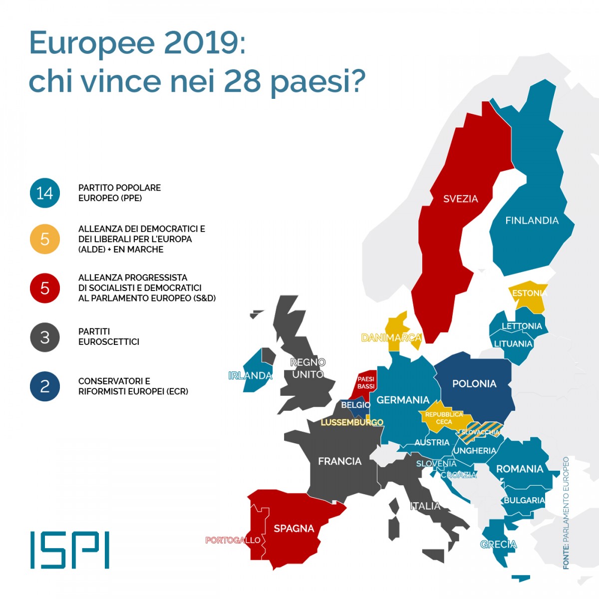 Allargando lo sguardo oltre l’Italia, dal voto europeo emerge che gli euroscettici crescono ma non stravincono, le famiglie politiche tradizionali – Popolari e socialisti – perdono consensi, ma ne conquistano di nuovi i liberali e soprattutto i verdi, che sorprendono sia in Germania che in Francia. Nel nuovo Parlamento europeo i Popolari dovrebbero ottenere 179 seggi, i socialisti e democratici 152, ben 69 i verdi (che nella passata legislatura ne avevano 52) e 105 alla formazione che raggruppa l’Alde (che da sola aveva 62 seggi nel precedente Parlamento) e l’En Marche di Macron. Il gruppo sovranista fondato da Matteo Salvini, l’Europa delle nazioni e della libertà, conquisterebbe 60 seggi, i conservatori e riformisti – a cui aderiscono i Fratelli d’Italia di Giorgia Meloni – 60.