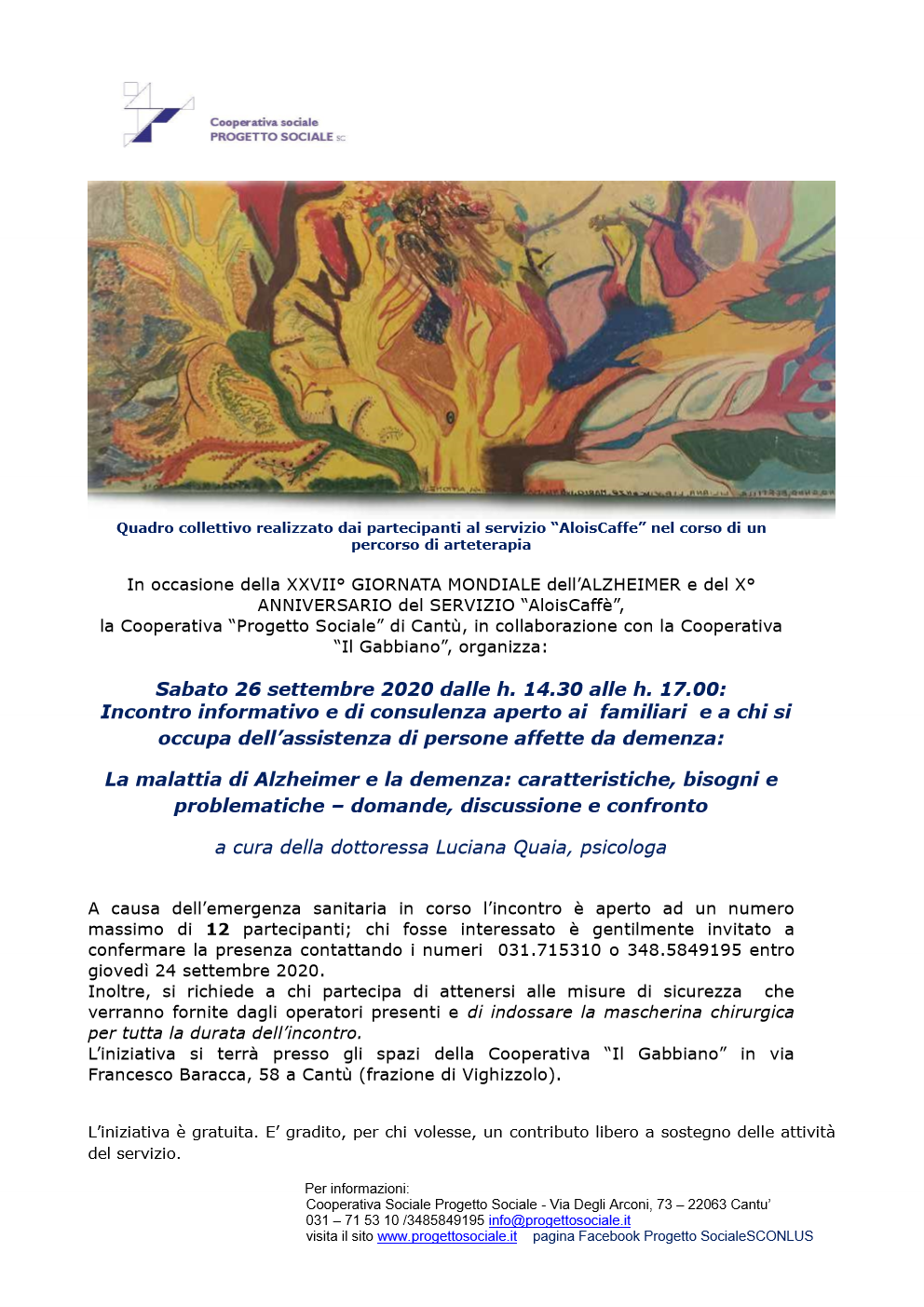in occasione della XXVII° Giornata Mondiale dell’Alzheimer, la nostra Cooperativa organizza un incontro informativo e di scambio aperto ai familiari, agli assistenti familiari e a tutte quelle persone che abbiano interesse ad approfondire le tematiche legate alla demenza senile.
