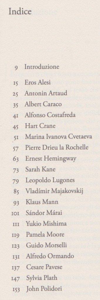 SCHIMPERNA Susanna, L’ultima pagina. Da Vladimir Majakovskij a David Foster Wallace, da Cesare Pavese a Virginia Woolf , storie di scrittori che hanno deciso di togliersi la vita, Iacobelli editore, 2020. Indice del libro