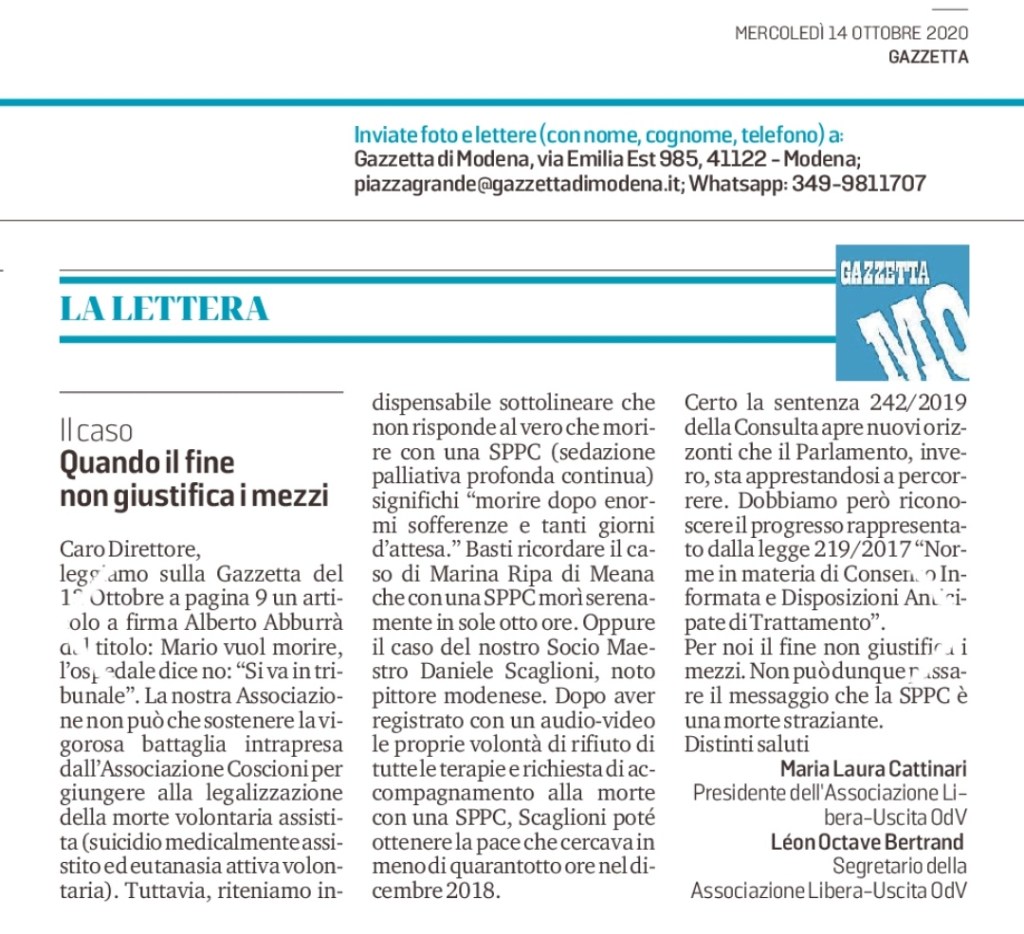 Lettera pubblicata sulla Gazzetta del 12 Ottobre per fare chiarezza sulla Sedazione Palliativa Profonda e continua