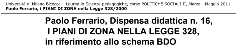 link alla dispensa : Paolo Ferrario, Dispensa didattica n. 16, I PIANI DI ZONA NELLA LEGGE 328, in riferimento allo schema BDO