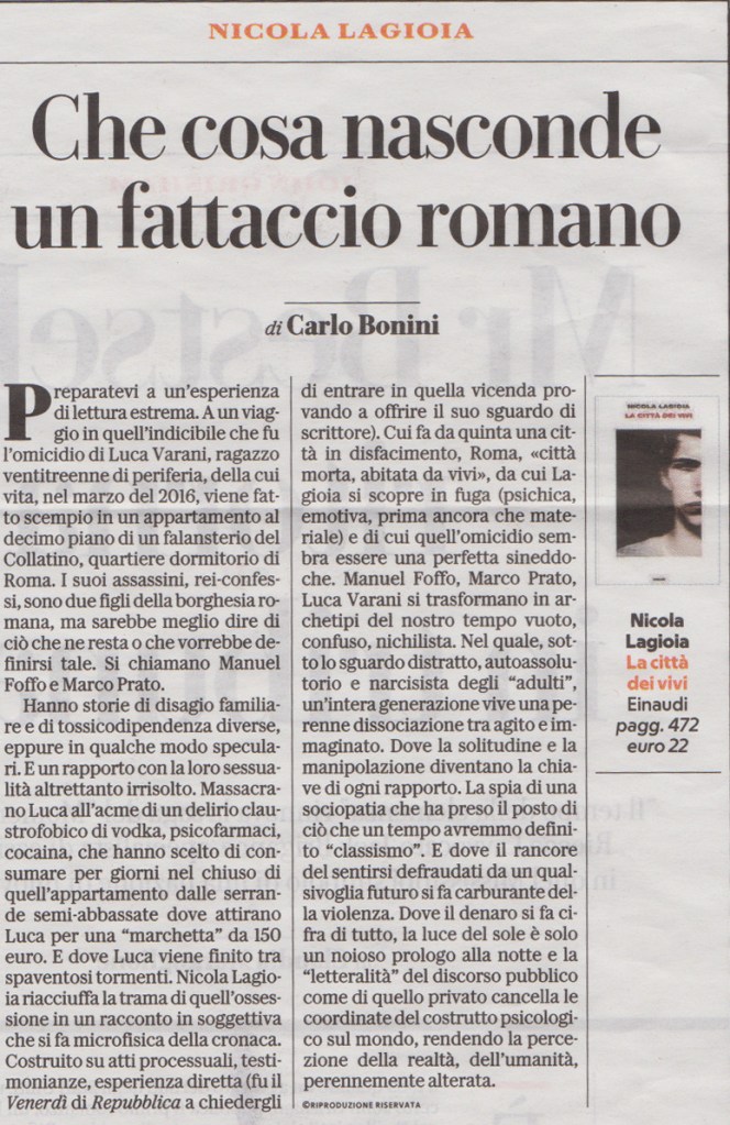 La città dei vivi di Nicola Lagioia (Einaudi). Così l’autore su Tuttolibri (La Stampa):