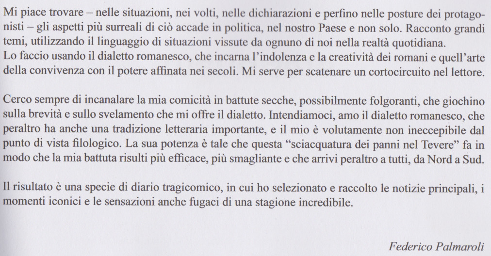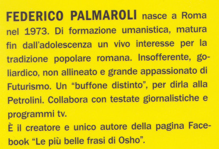 È partito con Osho (#lepiùbellefrasidiOsho), ma poi è diventato ben altro. Federico Palmaroli è il fenomeno della satira di questi tempi articolati e complessi, la lente d’ingrandimento della comicità sulla scena politica italiana. Attraverso il suo sguardo l’attualità sfuma nella battuta, le polemiche si sciolgono nell’ironia pungente, la politica diventa uno show surreale e divertente… messi in fila, uno dietro l’altro, i migliori “meme” di Federico Palmaroli diventano lo specchio di un Paese in bilico tra profonde certezze e gran- di contraddizioni e un modo alternativo per entrare nelle pieghe della nostra società. L’attualità e la politica sono viste con gli occhi sarcastici e disincantati della satira: tutto, nella sua esilarante sintesi in romanesco che si sovrappone con irriverente acume a foto di cronaca, assume contorni più leggeri e ci porta, sempre, a una risata liberatoria. Come una sorta di moderno dizionario, Vedi de fa poco ’o spiritoso è un libro che ci permette di capire chi siamo, dove andiamo e perché ci siamo persi per strada…