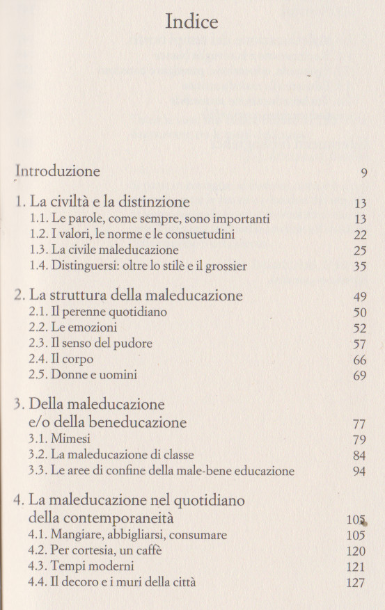 La maleducazione, oggi, non si può più considerare come assenza o insufficienza di “buona educazione”. A differenza di quella del passato, non è espressione di subculture definibili come devianti, artistiche, antagoniste, bensì manifestazione, pur se in forme ed espressioni variegate, di culture anche maggioritarie e socialmente legittimate. Non è lo scarto, la zona d’ombra della “beneducazione”: ha vita e autonomia proprie, costituisce inoltre uno dei segni della profonda crisi, o del definitivo esaurimento, dei comportamenti e dei vincoli relazionali auspicati dalle “narrazioni” riconducibili al cristianesimo, al marxismo, al liberalismo democratico.