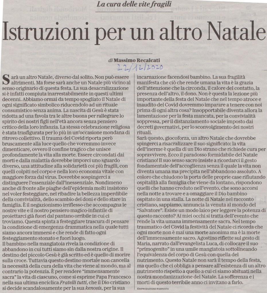 Istruzioni per un altro natale, di Massimo RECALCATI, in La Repubblica, 22 dicembre 2020