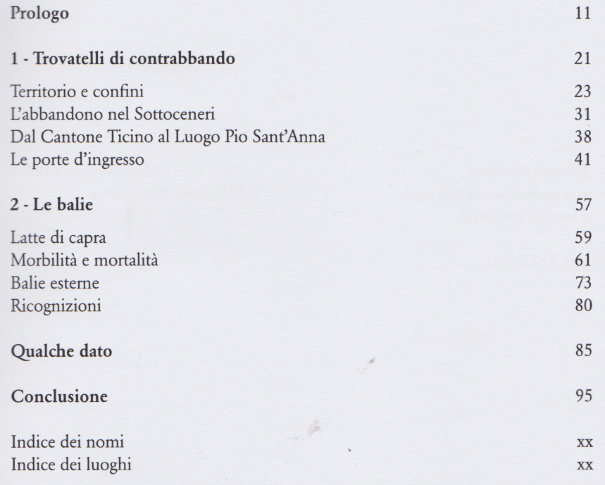 Il tema cruciale dell’infanzia abbandonata è al centro di questa ricerca. L’opera ripercorre le vicende – assai poco note – dei cosiddetti “esposti” e “trovatelli”, ponendo i propri confini di ricerca in un’area geografica significativa, estesa tra il Sottoceneri e l’adiacente antica provincia comasca. Lo sfondo temporale è quello compreso tra inizio del Settecento e fine dell’Ottocento. Con lo studio di fonti storiche eterogenee – alcune emerse in anni recenti e per la prima volta analizzate – vi si illustra l’aspetto del transito clandestino dei trovatelli dalla Svizzera italiana verso la terra lombarda, dove i piccoli terminavano il loro percorso approdando presso l’Ospizio degli esposti nella città di Como. Analogamente, si getta lo sguardo a un secondo aspetto della vicenda, non meno interessante: l’arrivo, in molti paesi della Svizzera italiana, sia di lattanti da svezzare – mandati dall’Ospizio medesimo presso le balie – sia di bambini slattati – conferiti, questi ultimi, a famiglie di “allevatori”. La ricostruzione della ricerca delinea il contesto complessivo, contrassegnato da abbandoni, ritrovamenti, accordi, compensi economici; la legge della domanda e dell’offerta vi svolgeva un ruolo non marginale, e non mancavano neppure gli interventi di autorità politiche, amministrative e giudiziarie.