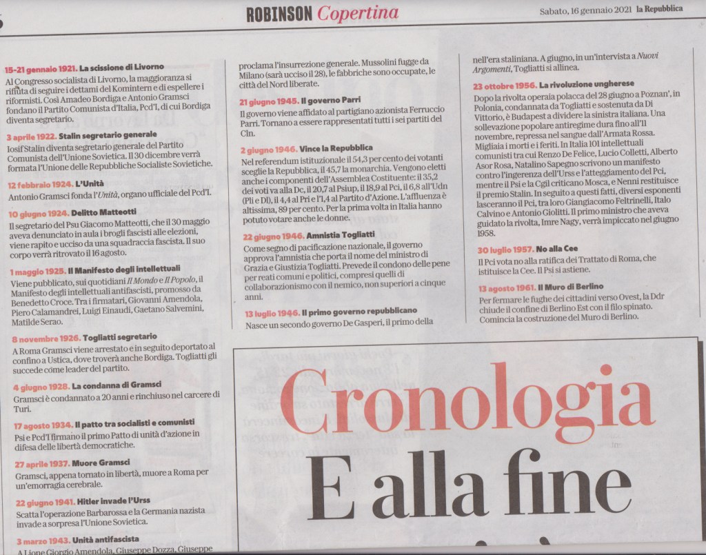 di Filippo CeccarelliRobinsonCento anni di Pci, ma cosa è rimasto? Poco, pochissimo, forse niente e tra un po’ neanche le memorie. Peccato, perché è una storia ricca di insegnamenti nei suoi ricordi di impegno ed eroismo, ma anche di amarezza. I libri che Antonio Gramsci teneva in carcere sono custoditi, insieme ai Quaderni, in una sorta di museo, fortilizio, macchina del tempo, sacrario e ipogeo del quartiere Nemorense nel quale l’ex senatore Ugo Sposetti, amanuense rosso, continua a concentrare documenti, registrazioni, insegne, mobilio, sculture, pitture, bandiere. C’è anche quella primigenia, rimasta nascosta per anni dentro la fodera di un divano in Molise, che i compagni della frazione comunista si portarono dietro, al canto dell’Internazionale, dal teatro Goldoni al teatro San Marco dopo la votazione che li rese fiammeggiante minoranza rivoluzionaria l’ultimo giorno del congresso di Livorno.