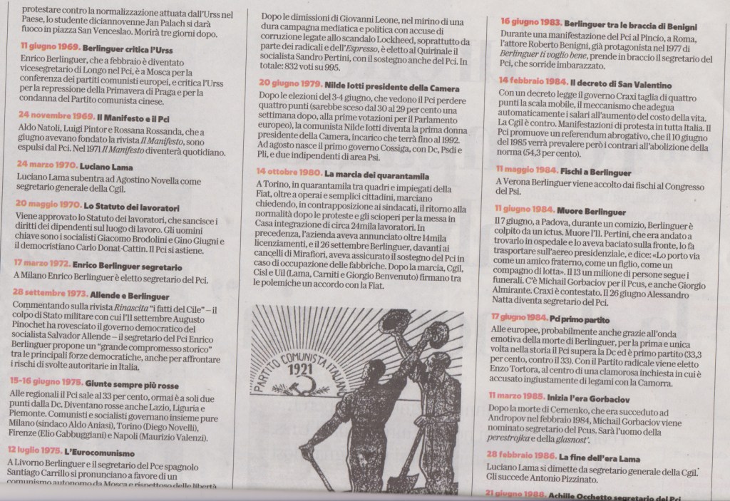 Cent’anni. Le scuole organizzate fin dentro le carceri fasciste, il contributo militare e di sangue delle Brigate Garibaldi, i reietti delle officine punitive alla Fiat e i comizi per i braccianti di Di Vittorio. Ma poi e soprattutto: il costume, lo stile di vita dei dirigenti, entità di cui oggi si è smarrita addirittura la nozione: i silenzi di Longo, la libertà di Terracini, la lingua tagliente di Pajetta, il fragore che suscitavano le uscite di Amendola, la timida dedizione di Berlinguer, la leale signorilità di Napolitano, l’impuntatura di Nilde Iotti sulle donne e il divorzio, la cortese naturalezza con cui Ingrao rifiutò la cospicua borsa dell’andreottianissimo Premio Fiuggi.