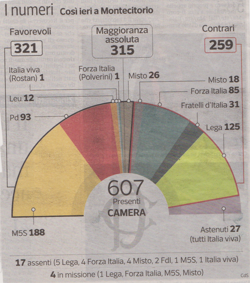 «Alla fine la conta si è risolta con un verdetto che per i sostenitori del premier è decisamente positivo. A votare la fiducia sono stati infatti 321 deputati, sei in più rispetto alla maggioranza assoluta di 315. I no sono stati 259 e 27 (i renziani) gli astenuti. Di fatto lo scarto tra favorevoli e contrari è circa il 10% dei componenti della Camera. A sorpresa ha votato a favore la forzista Renata Polverini, che ha annunciato subito dopo l’addio al suo partito. Tra i sostenitori di Conte oltre all’ex renziano De Filippo (rientrato nel Pd) anche Rostan (sempre di Iv) mentre dal misto sono giunti i sì al premier degli ex M5s: Aiello, Aprile, Benedetti, De Giorgi, Ermellino, Fioramonti, Trano e dell’ex leghista Lo Monte. Ci sono stati anche alcuni assenti di peso: Portas di Iv ma anche due pentastellati (Sarli e Del Monaco)» [S24].