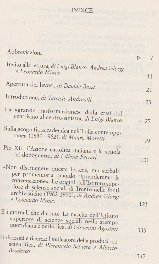 Nel contesto delle iniziative per il 50° anniversario della fondazione dell’Istituto superiore di scienze sociali, primo nucleo dell’Università di Trento, questo volume raccoglie gli atti del convegno dedicato alle fonti documentarie per la storia dell’Ateneo trentino. Da una ricognizione a largo raggio delle fonti disponibili, e in particolare di quelle archivistiche, emergono le complesse vicissitudini politiche, accademiche e scientifico-disciplinari che portarono alla nascita dell’Università a Trento. La vicenda qui ricostruita si rivela come una delle più interessanti tra quelle che caratterizzarono la stagione di riforme legate a livello nazionale al laboratorio politico del centro-sinistra. Dalla «periferia» di quell’Italia venne allora un contributo eccezionale d’innovazione, sotto la regia del presidente della Giunta provinciale trentina – Bruno Kessler – e grazie al coinvolgimento delle migliori intelligenze del paese, portando al varo del primo corso di laurea in Sociologia aperto in Italia e contribuendo a disegnare il volto del moderno Trentino nel contesto di un nuovo profilo dell’autonomia speciale.