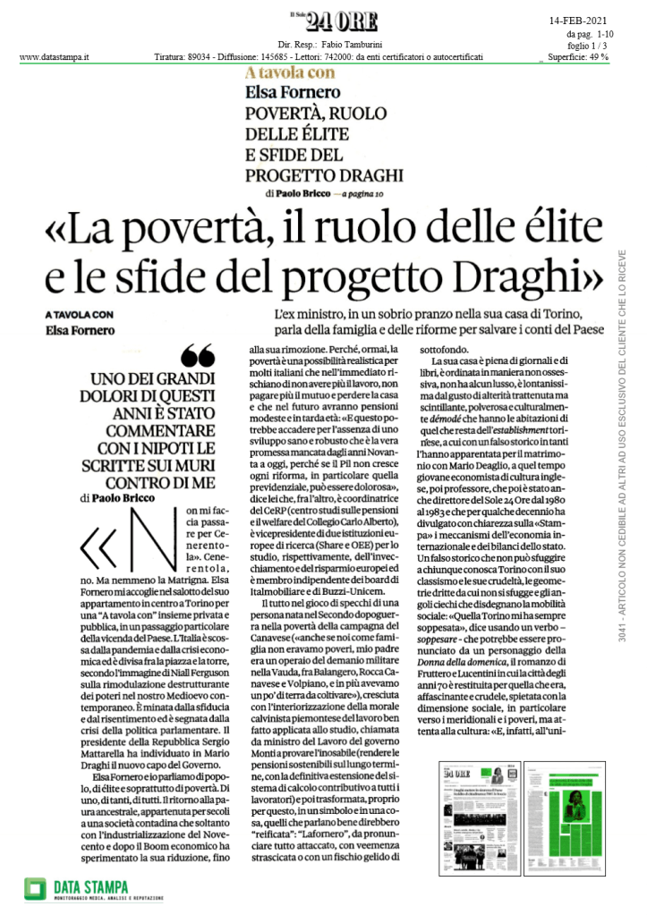 Il presidente della Repubblica Sergio Mattarella ha individuato in Mario Draghi il nuovo capo del Governo. Elsa Fomero parla di popolo, di élite e soprattutto di povertà. Di uno, di tanti, di tutti. Il ritorno alla paura ancestrale, appartenuta per secoli a una società contadina che soltanto con l’industrializzazione del Novecento e dopo il Boom economico ha sperimentato la sua riduzione, fino alla sua rimozione. Perché, ormai, la povertà è una possibilità realistica per molti italiani che nell’immediato rischiano di non avere più il lavoro, non pagare più il mutuo e perdere la casa e che nel futuro avranno pensioni modeste e in tarda età.