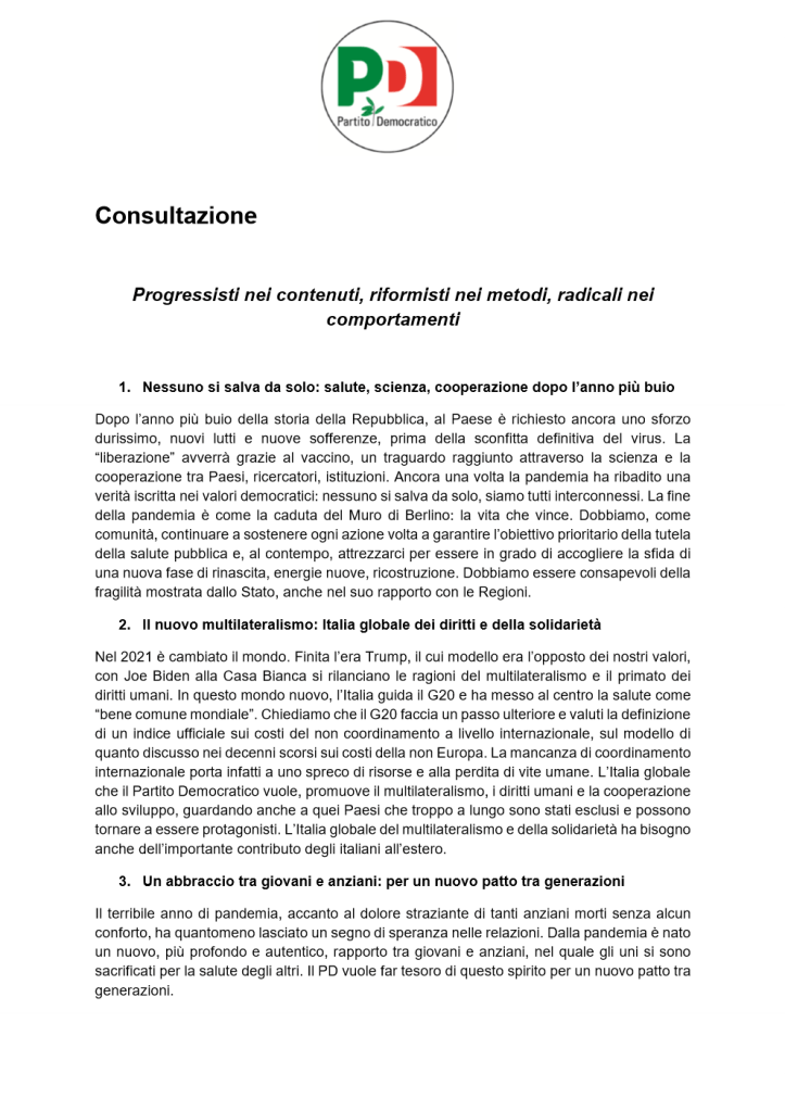 PD – Partito Democratico: il programma per la consultazione politica, marzo 2021
