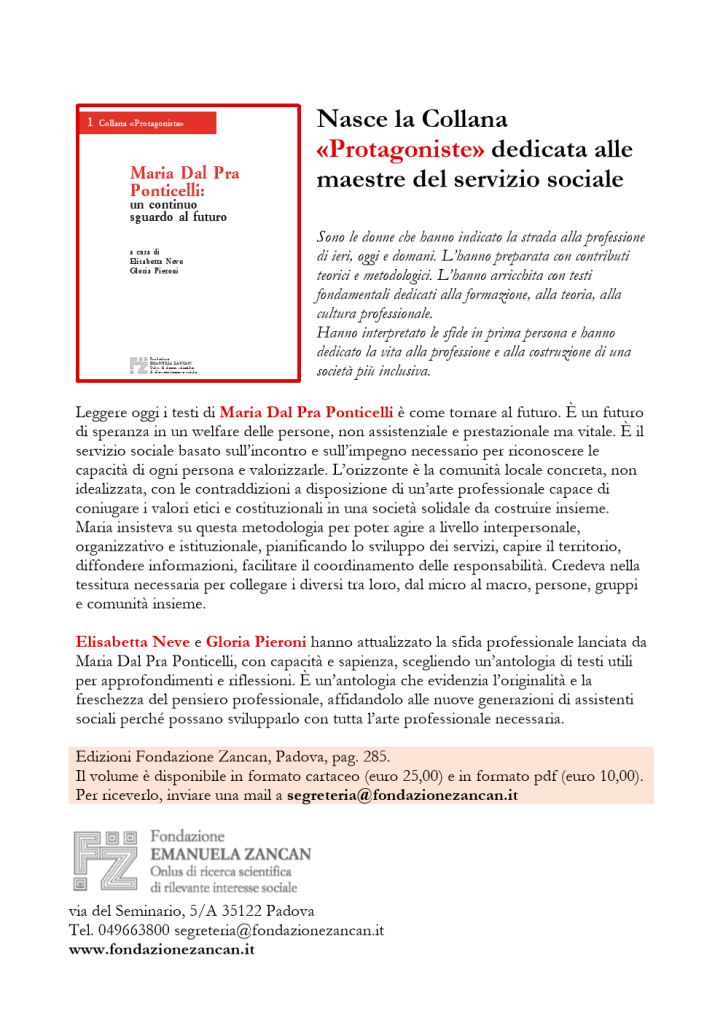 Il volume, parte della collana “Protagoniste,” raccoglie i testi originali di Maria Dal Pra Ponticelli, una figura centrale nella storia del servizio sociale italiano che si è spenta nel 2018. La pubblicazione include presentazioni che ne evidenziano il valore storico, teorico e metodologico, sottolineandone anche l’attualità. Il libro offre un’ampia riflessione interdisciplinare sulla professione del servizio sociale, con particolare attenzione alla sua evoluzione storica e prospettive future.