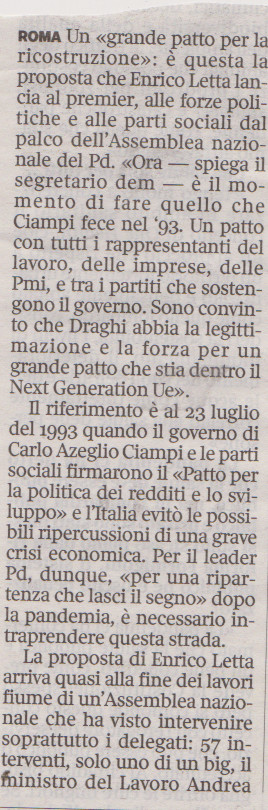 Enrico Letta (PD): un grande patto per la ricostruzione … è il momento di fare quello che fece Ciampi nel 1993 …, 17 aprile 2021