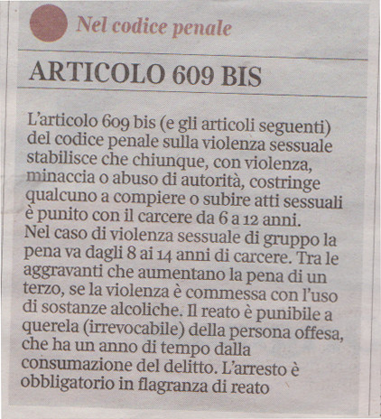 l’articolo 609 bis del codice penale sulla VIOLENZA SESSUALE