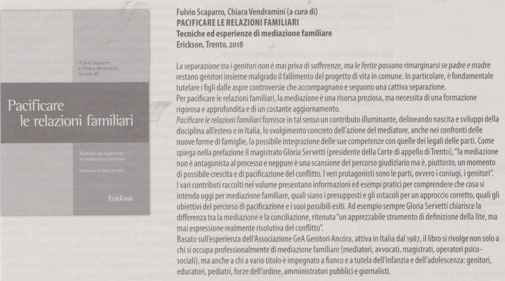 SCAPARRO Fulvio, VENDRAMINI Chiara (a cura di), Pacificare le relazioni familiari. Tecniche ed esperienze di mediazione familiare, Erickson, 2018